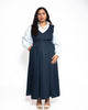 This layered pinafore dress brings a modern twist to classic silhouettes. Featuring a deep V-neck overlay paired with a powder-blue shirt insert, this piece exudes understated sophistication while offering complete comfort.