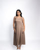 A minimal satin-finish midi dress featuring a soft halter neckline and flowy A-line silhouette. Chic and elegant for day-to-night styling.