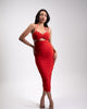 Make hearts skip a beat in our Ruched Bodycon Dress — where fiery meets flirty. Designed in a sultry bodycon silhouette, this dress features all-over ruching to contour your curves, while the strategic front cut-outs and twisted bust detail add a daring edge. The double spaghetti straps offer extra support with a flirty finish, and the midi length keeps it chic and classy. Whether it’s date night or a girls’ night out, this one’s a total showstopper
